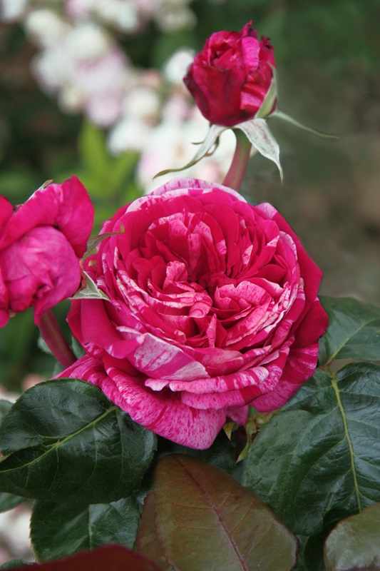 Grootbloemige struikroos, aantrekkelijke grote bloemen met een prachtige kleur: fuchsia-roze, wit gestreept. De bloemen worden gedragen door een struik met donkergroen en glanzend blad. Deze grootbloemige struikroos, met een uitzonderlijke lange bloei, die een aangenaam, sterk, fruitig parfum verspreiden. Zeer resistente rozenstruik die gemakkelijk te kweken is. Hij bloeit van mei tot de vorst.