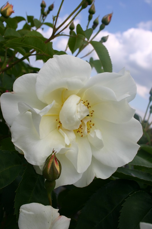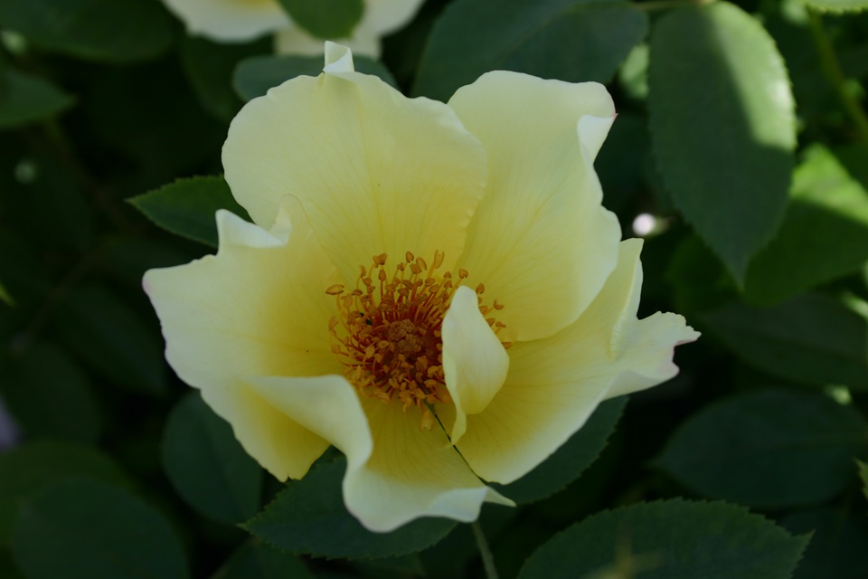 Dit is een soort heesterachtige versie van de beroemde 'Mermaid'. Hij heeft grote, bijna enkele, gele bloemen met roodbruine meeldraden en een verfrissende geur. Deze roos heeft lichtgroen blad en bloeit voortdurend. Plant 3 rozen per m2.