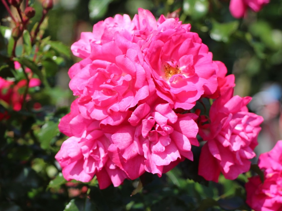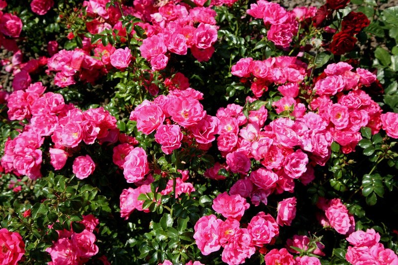 Kleine, halfgevulde, karmozijnroze-rode bloemen staan de hele zomer in grote trossen. Lage en gespreide groeiwijze, zoals alle rozen uit de ‘Flower Carpet’™-serie. ADR®-predikaat. Plant 3 rozen per m2.