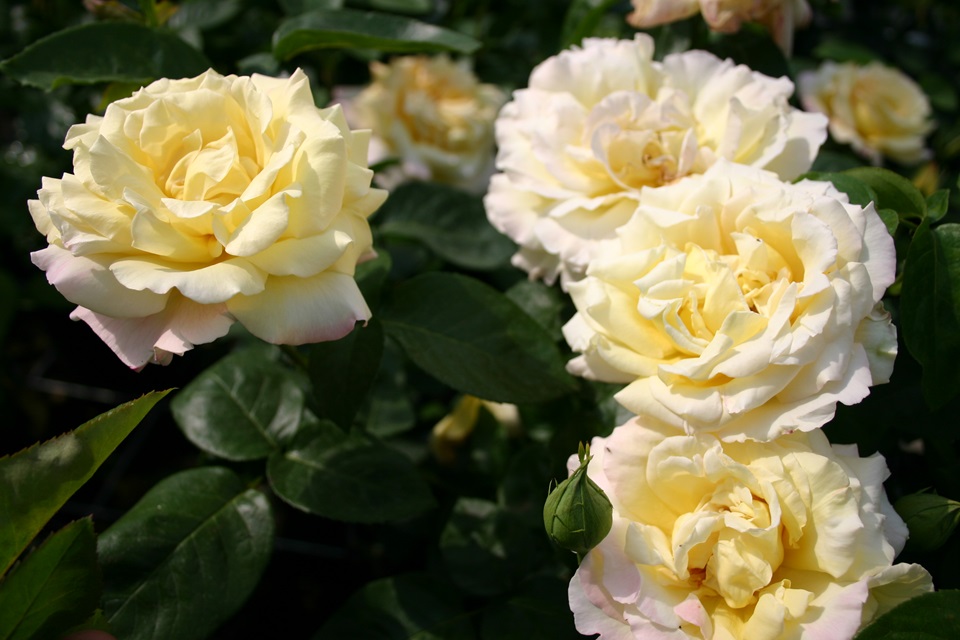 Lichtgeel, soms met roze zweem. Grote, zware bloemen, die volledig geopend het mooist zijn. Sterk en betrouwbaar.
