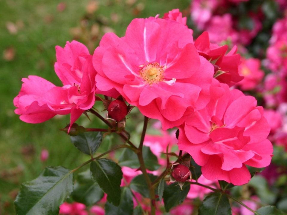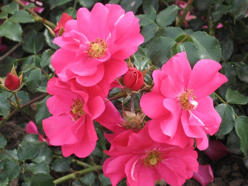 Niet verblekende, dieproze, halfgevulde bloemetjes die licht geuren. Dit