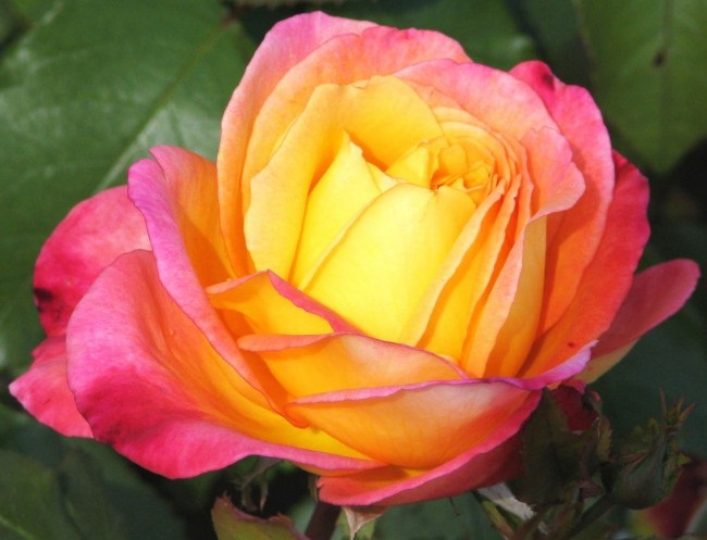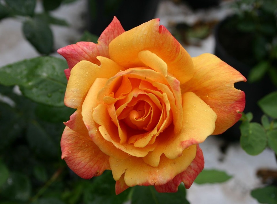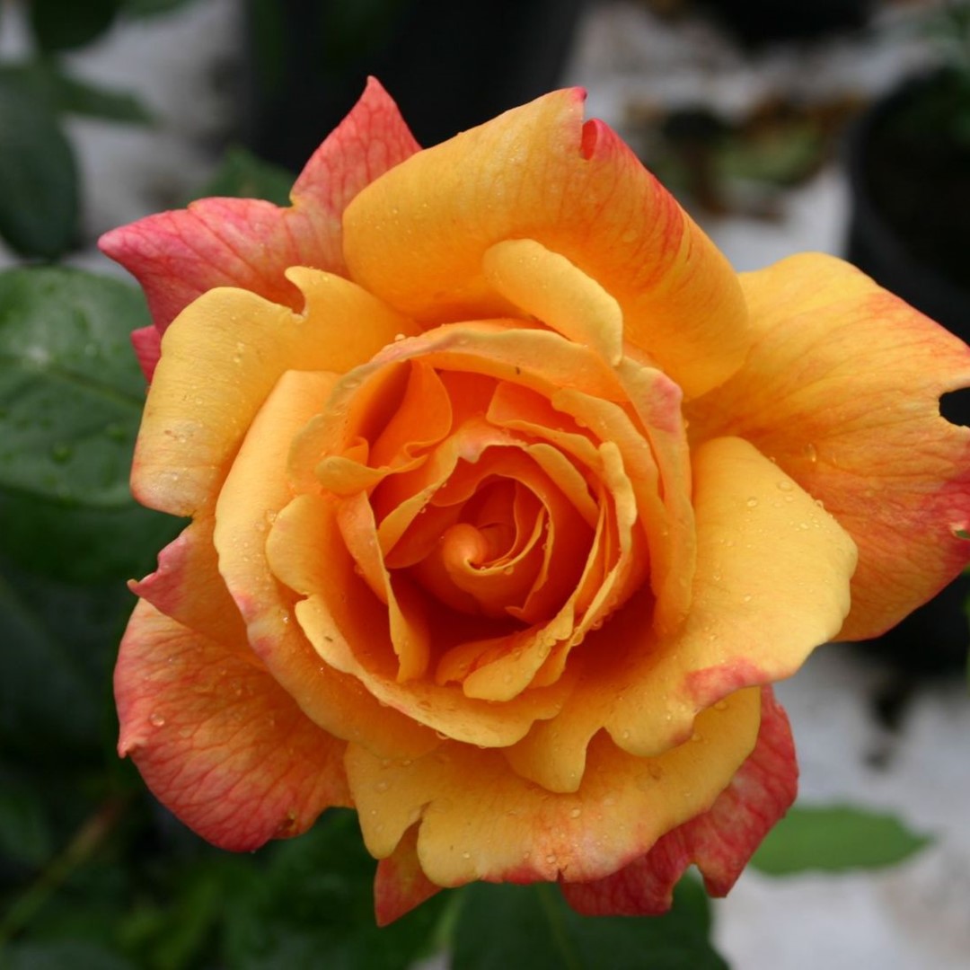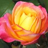 Grote halfgevulde geeloranje bloemen met een rozerode zweem. Mooie opgaande struik met stevige stelen. Geurt goed.