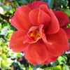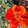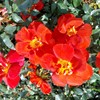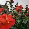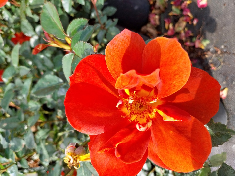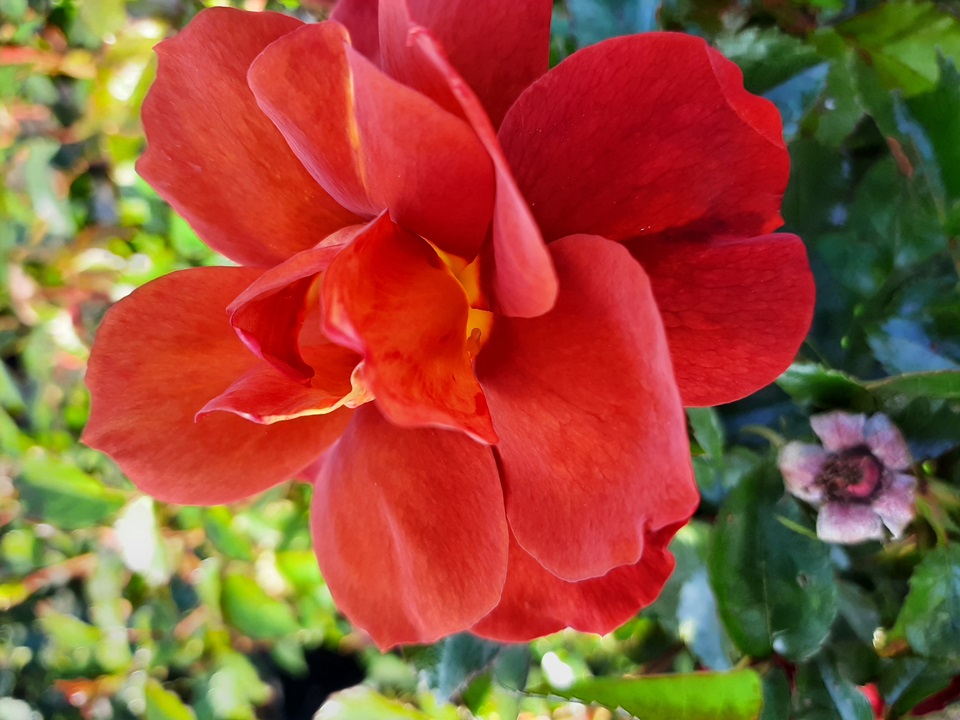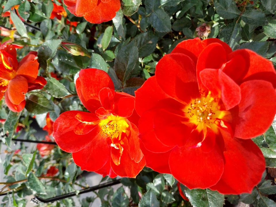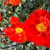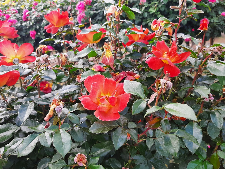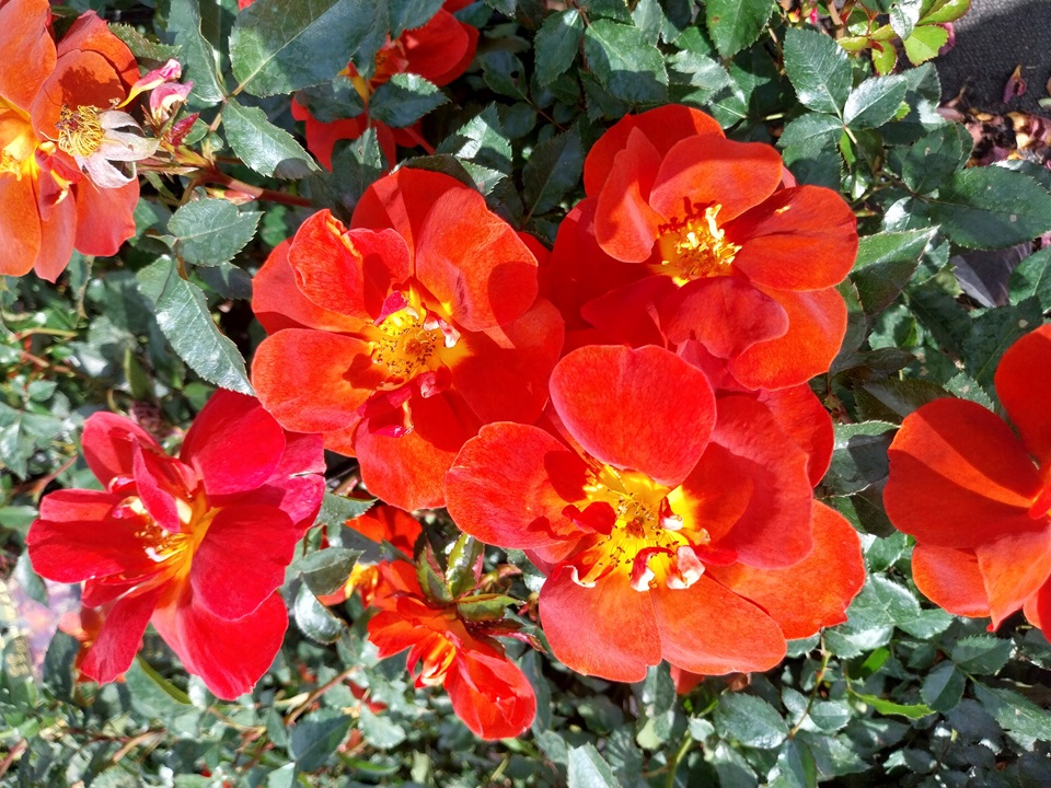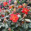 Mooie struikroos met glanzend blad en rood/bruine rozen.