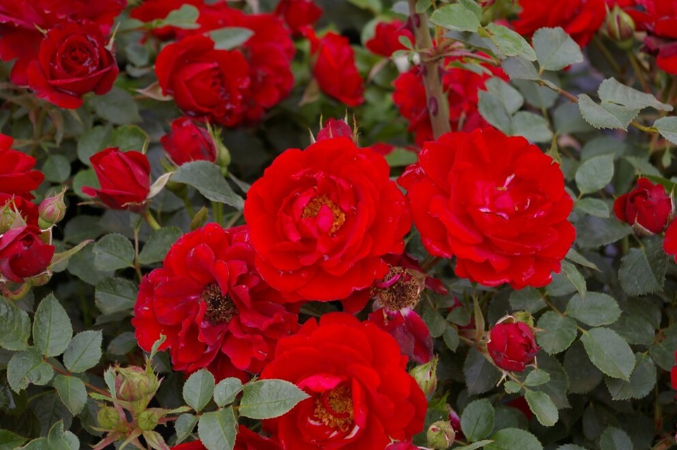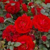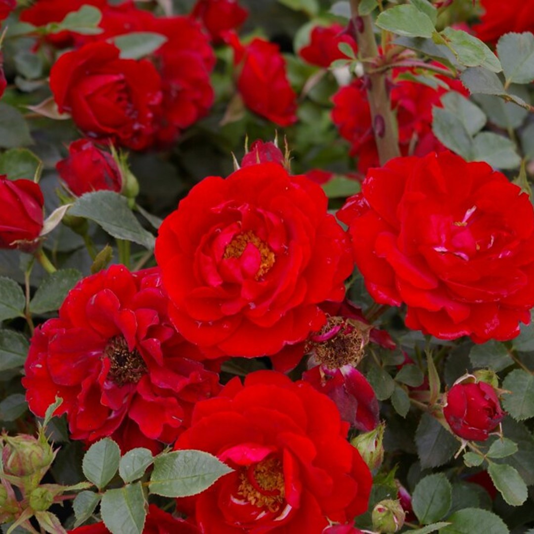 Trosroos met veel gevulde bloemen. De bloemen zijn fluweel donkerrood.