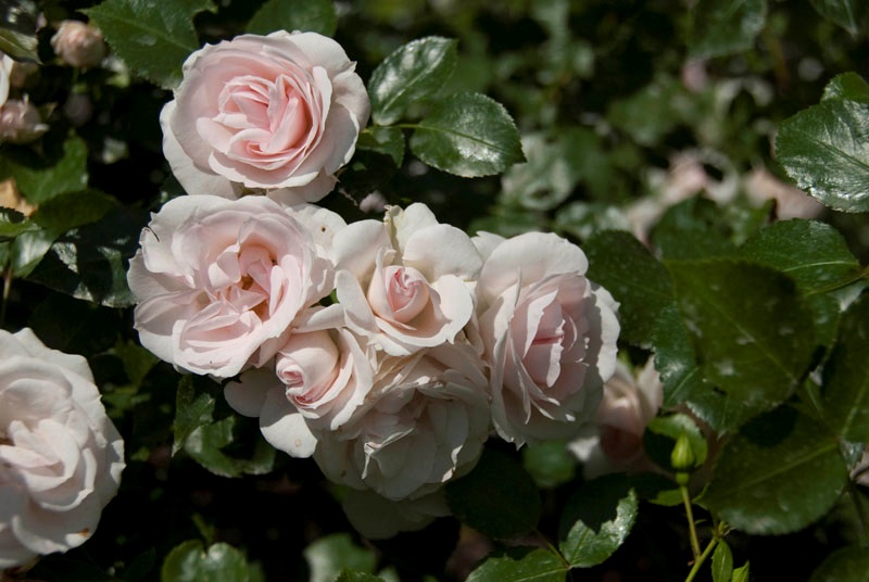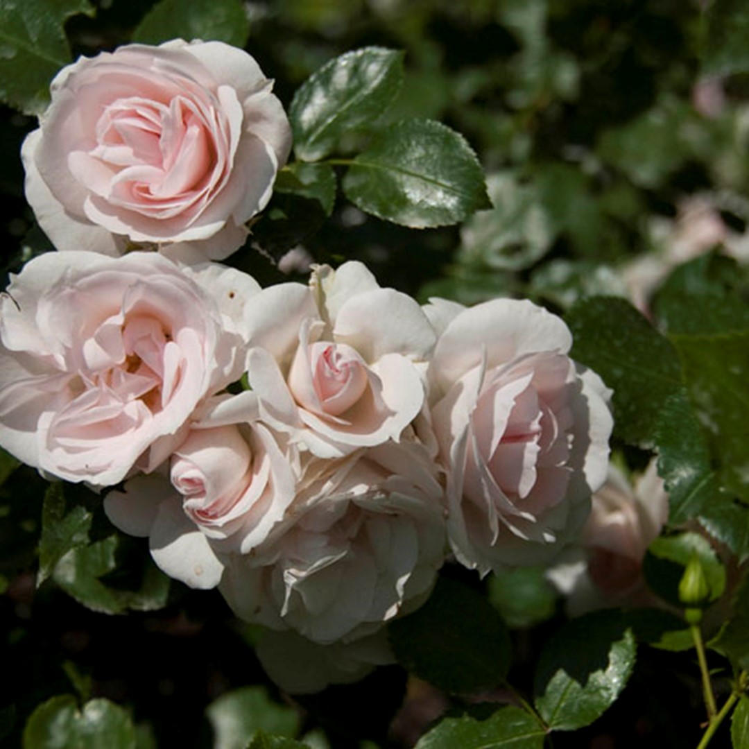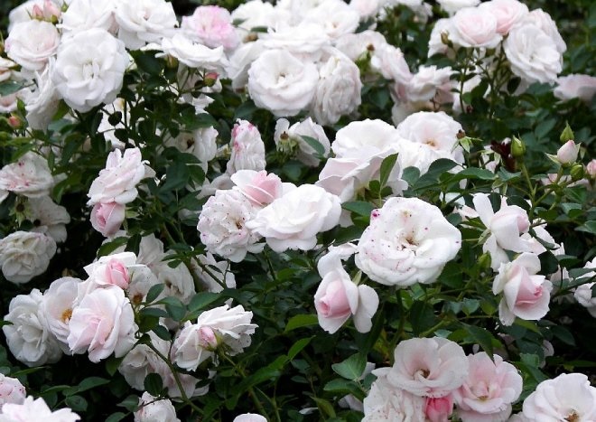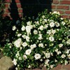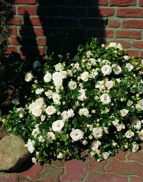 Deze mooie en sterke ADR®-roos heeft een klassieke bloemvorm, is halfgevuld en wit met een zweem van roze; fraai donker, glanzend blad. 60 x 50 cm.