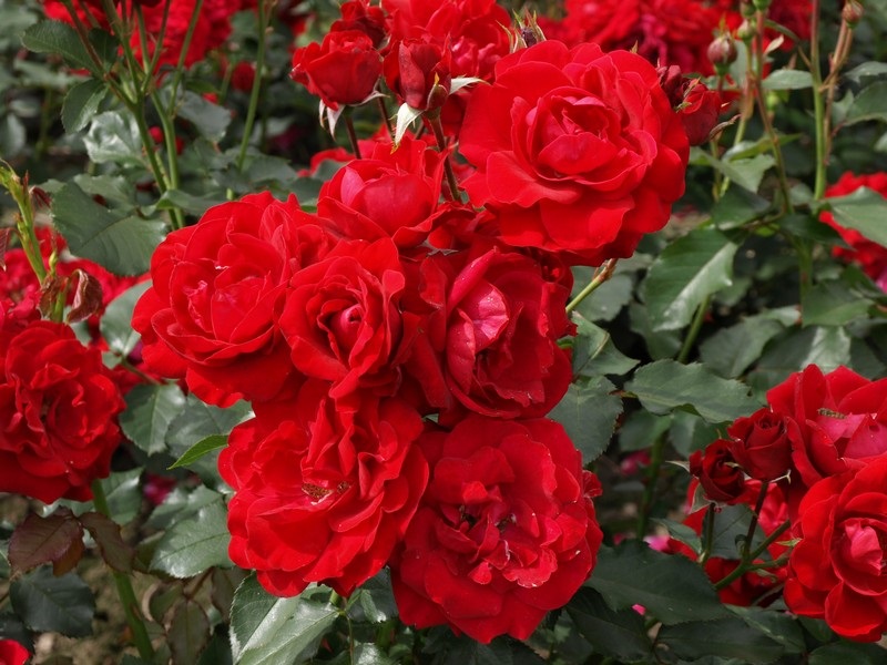 Bloedrode gevulde bloemen staan in kleine trossen aan een compacte