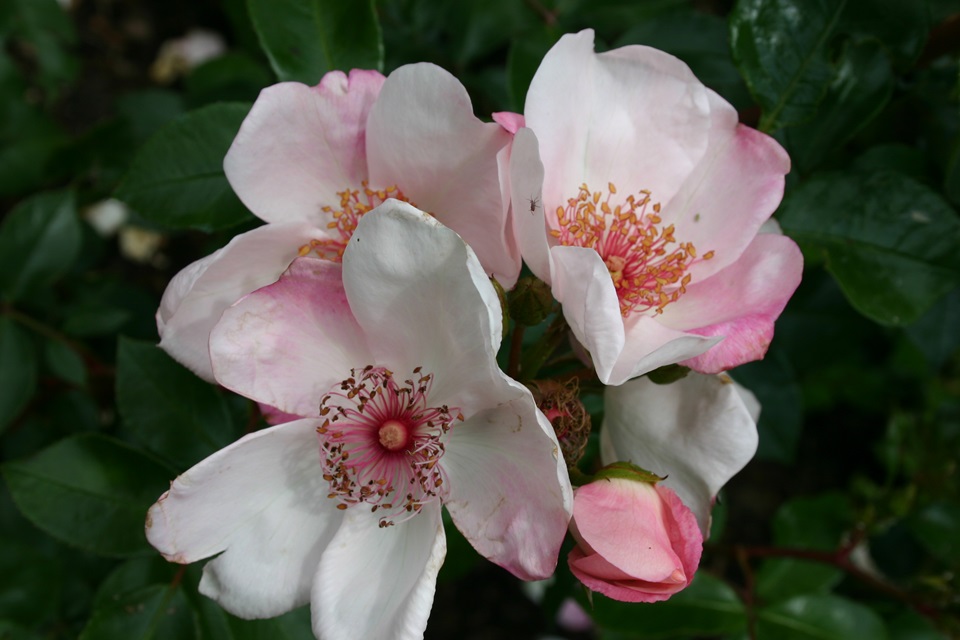 Een bijzonder mooie enkelvoudige bloem in pastelroze-wit siert deze plant. Een mooier contrast met de donkergroene blaadjes is niet te vinden! Deze roos komt goed tot zijn recht in kleine groepen. Trekt bijen aan!
