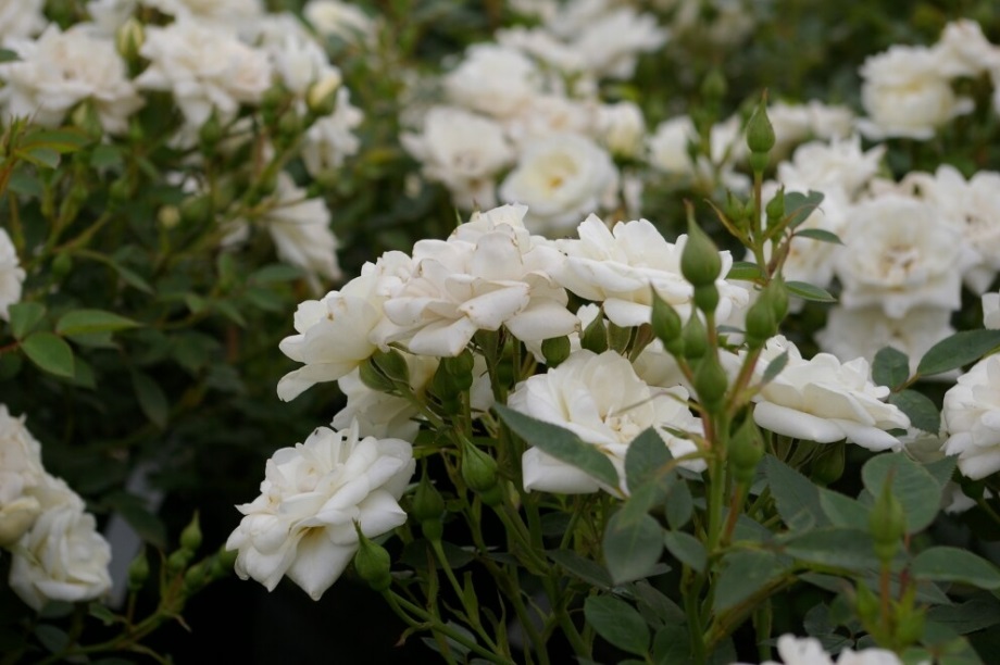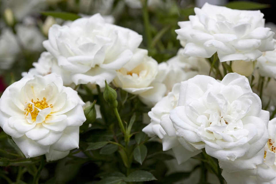 Halfgevulde witte bloemen met gele meeldraden aan een bossige struik die goed uitstoelt. Deze TOP-roos heeft lichtgroen fijn blad, gezond en sterk.