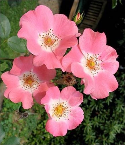 Enkele, kleine zachtroze bloemen met een geel hart. Deze roos met ADR® en TOP®-roospredikaat bloeit rijk met goed verdeelde bloemen. Hij heeft glimmende blaadjes. Plant 3 rozen per m2.