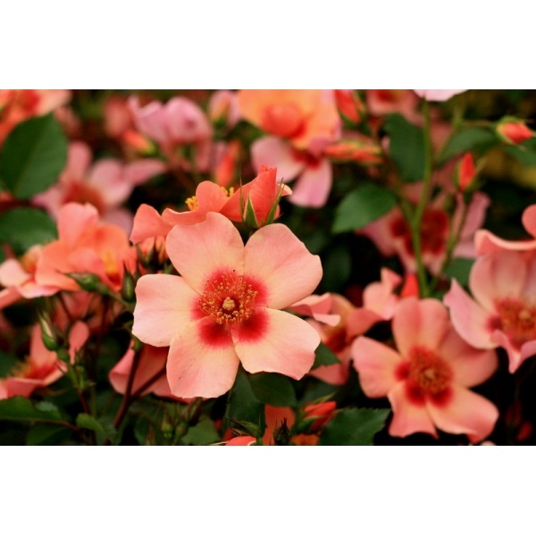 De bloemen zijn zalm-abrikoos kleurig. Het blad is glanzend en gezond. Doorbloeiende roos. Geurend