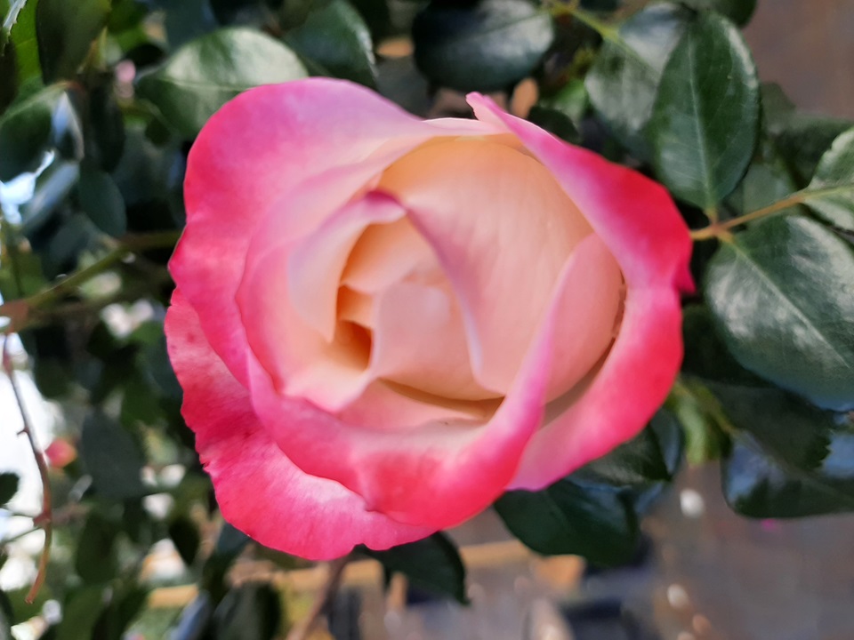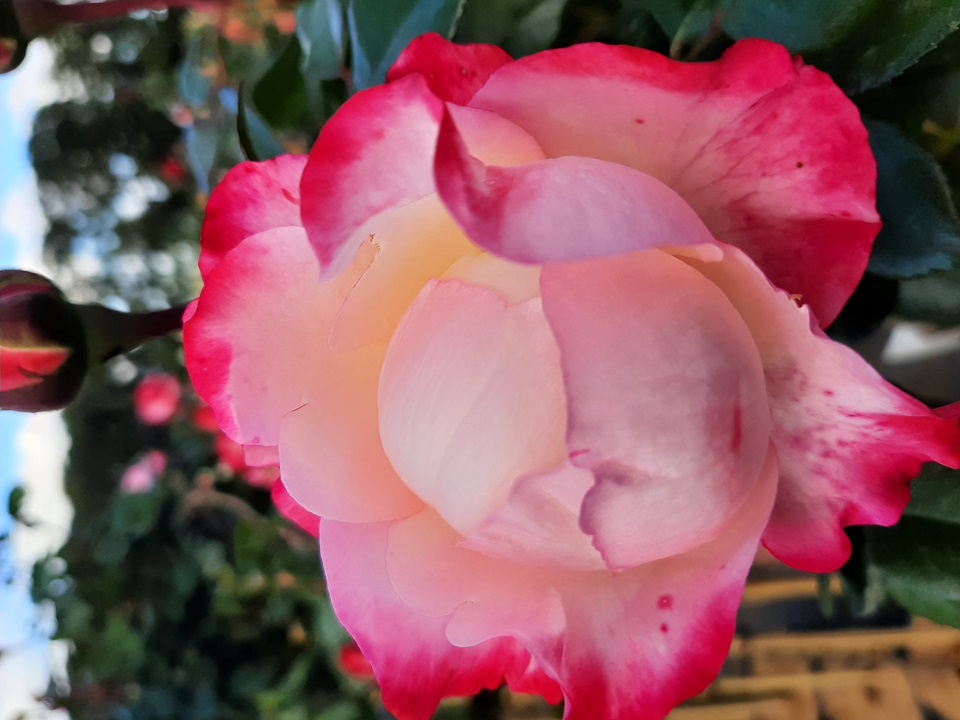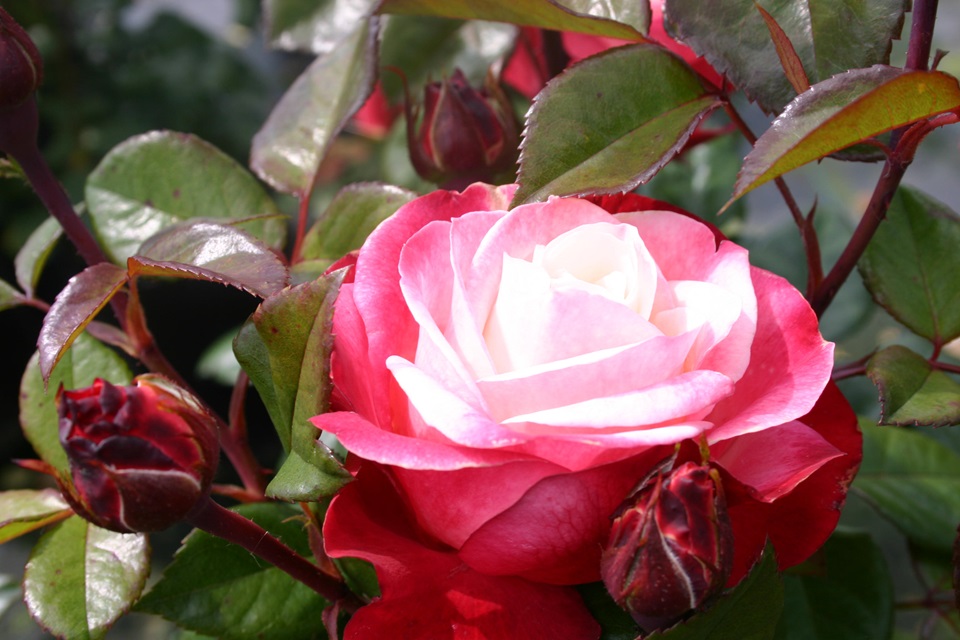 Heerlijk geurend, nostalgisch aandoende bloemvorm in fraai crèmewit met kersenrood. Het glanzende, leerachtige blad van deze snijroos loopt prachtig donkerrood uit.