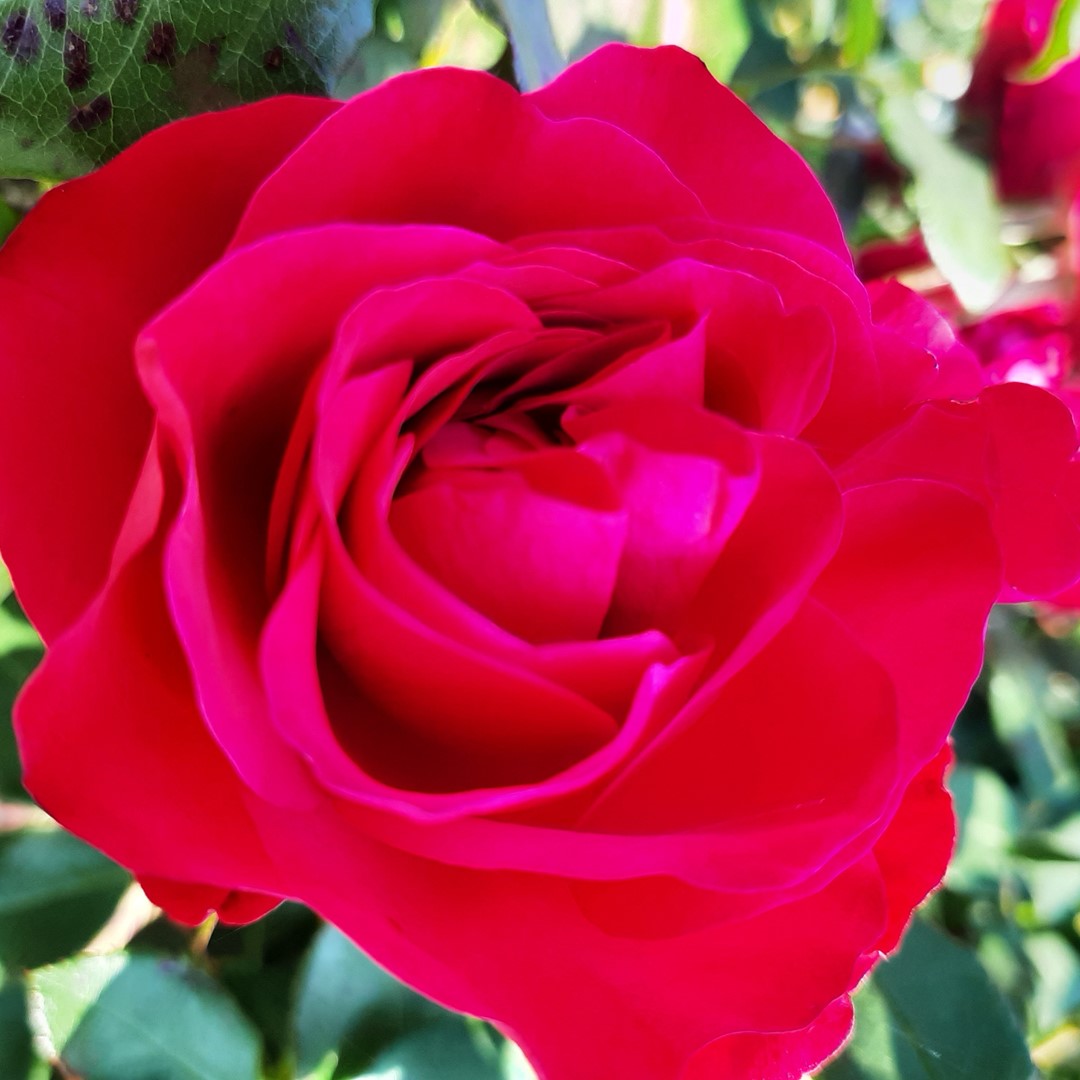 Deze roos heeft mooie rode bloemen die de hele zomer doorbloeien.