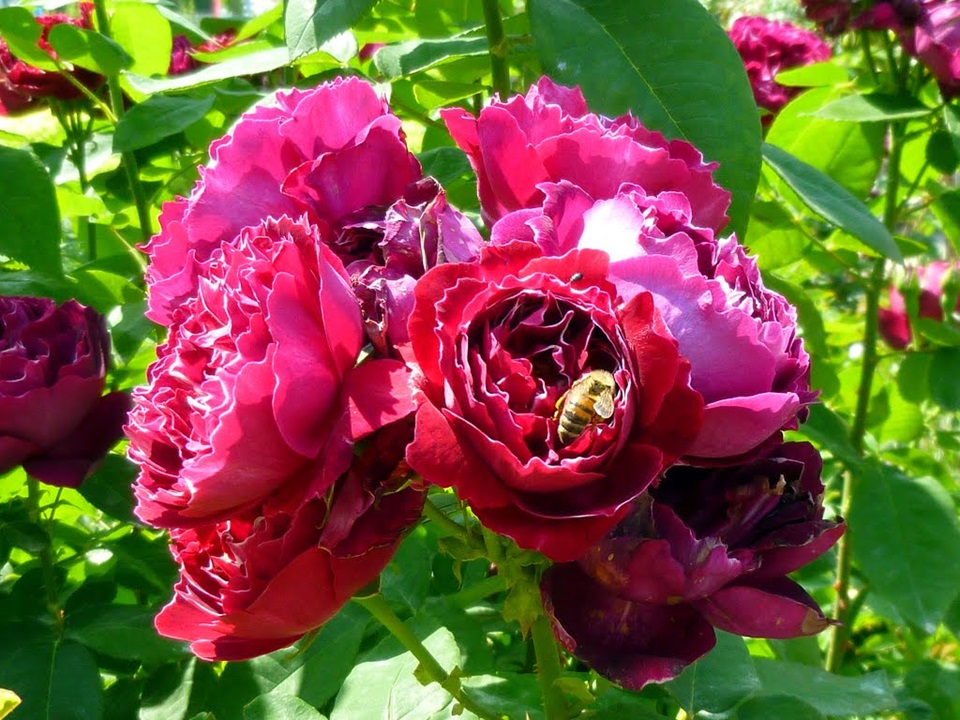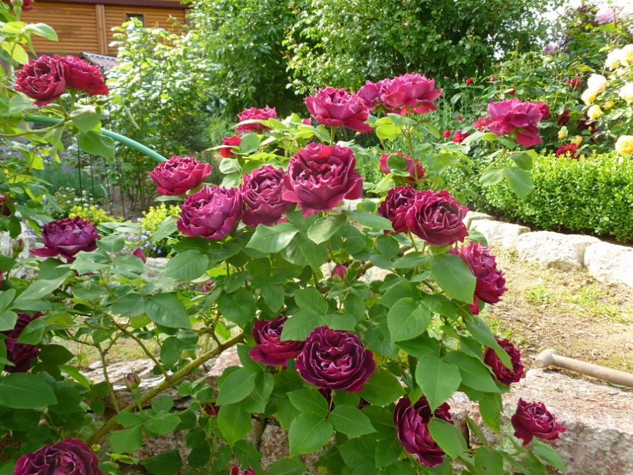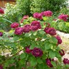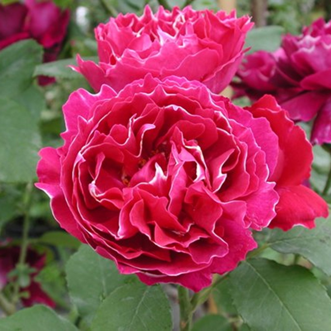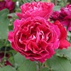 Verfijnde, grote, gevulde bloemen in een donkere, karmozijnrode kleur, die aanvankelijk komvormig zijn en later wijd opengaan; de bloemblaadjes hebben een dunne witte rand, wat de bloem een aantrekkelijk uiterlijk geeft. Een sterke, mooi gevormde struik. Zeer geurig. 120 x 120 cm. Plant 3 rozen per m2.