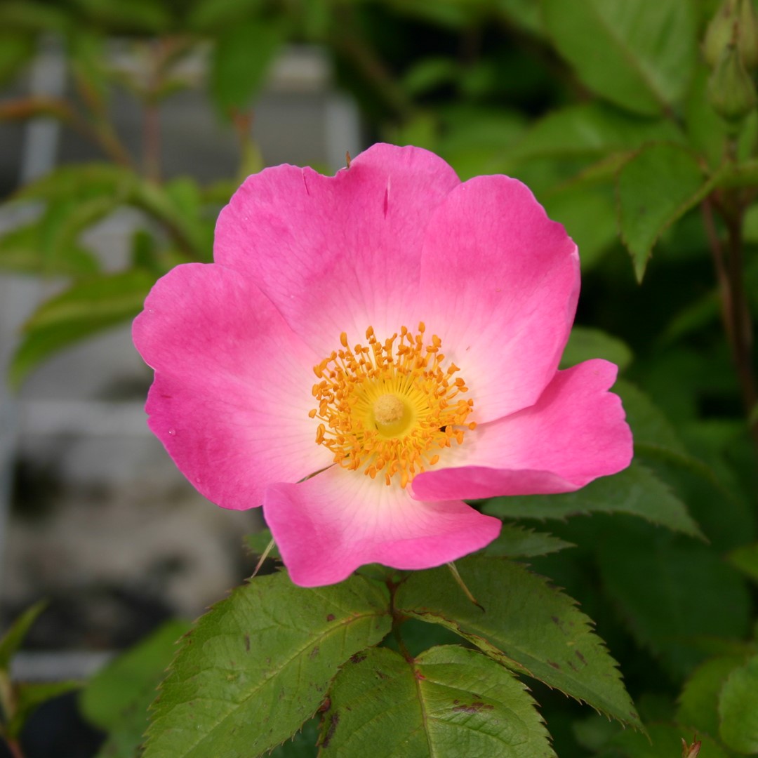 Deze roos, waarschijnlijk een canina-gallica-hybride, heeft bloemen met