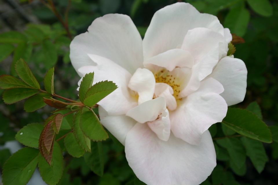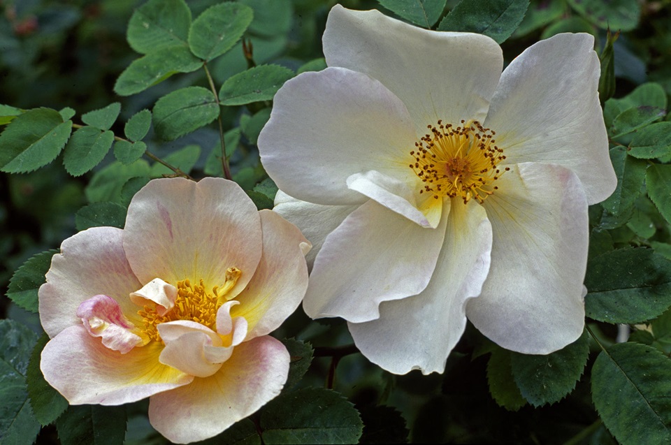 Halfgevulde, crèmewitte bloemen met een doorsnede van ongeveer 10 cm met gele meeldraden. De takken zijn roodbruin met klein, lichtgroen blad. Vroeg in het seizoen is het een prachtig gezicht als de takken van deze plant vol staan met bloemen. Later in het seizoen is de bloei onregelmatiger.