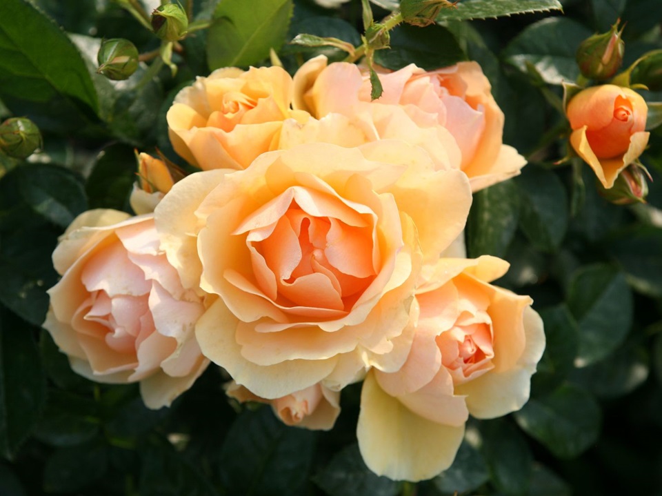 Zeer mooie abrikooskleurige bloemen die het gehele seizoen bloeien in kleine trossen. Het frisgroene blad steekt mooi af bij de amber/abrikooskleurige bloemen. 60 - 80 cm, plant 5 rozen per m2.