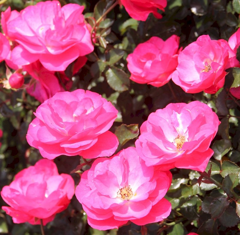 Deze bodembedekkende roos heeft dieproze, halfgevulde bloemen met fraai warm oranje hartjes, hij is doorbloeiend en heeft het ADR®-predikaat. Plant 3 rozen per m2.