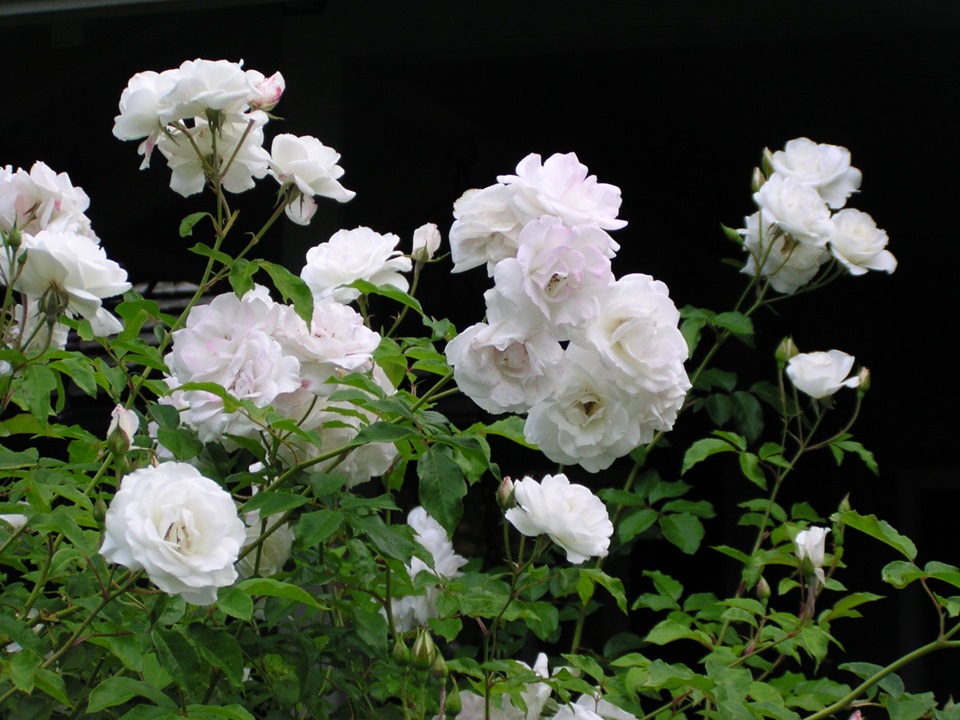 Waarschijnlijk de beste trosroos op stam. Talloze, halfgevulde, zuiverwitte bloemen. Vormt een mooie, bossige kruin.