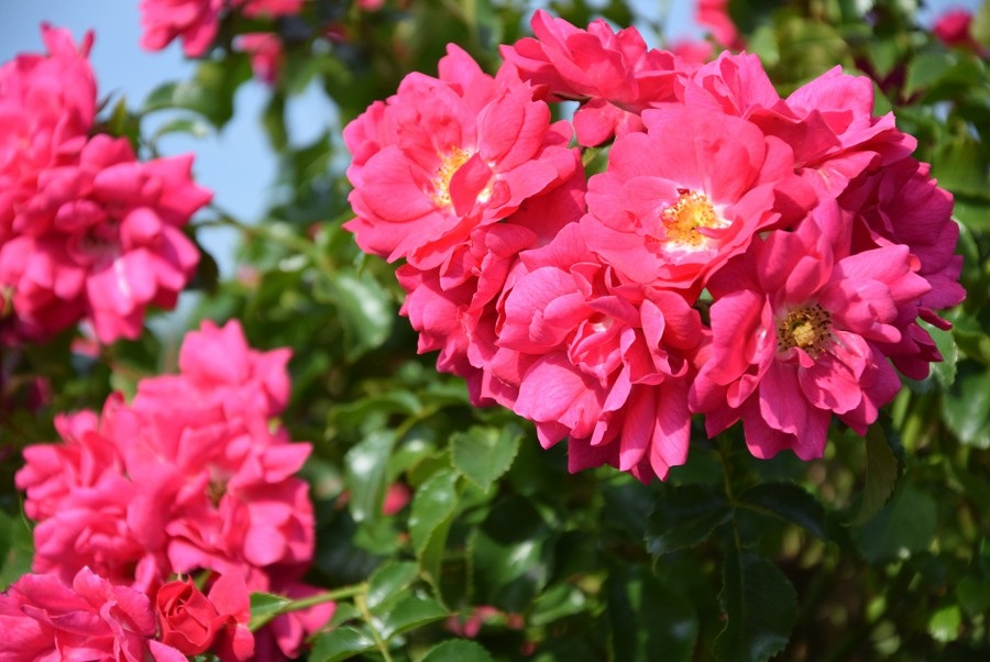 Kleine, halfgevulde, karmozijnroze-rode bloemen staan de hele zomer in grote trossen. Lage en gesprijde groeiwijze, zoals alle rozen uit de ‘Flower Carpet’™-serie. ADR®-predikaat.