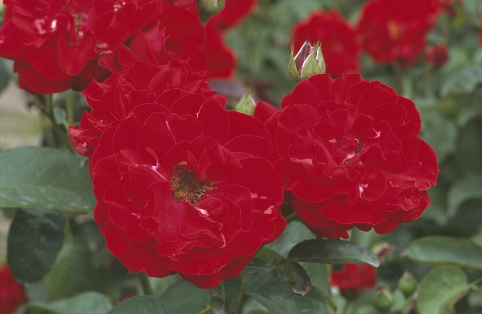 Donkerrode, niet verkleurende fluweelachtige bloemen, mooi gevuld. Donker blad. De bloemen staan fier boven de struik. Deze ADR-roos is gezond en sterk en heeft een bossige groeiwijze.