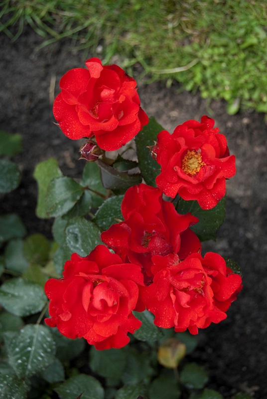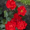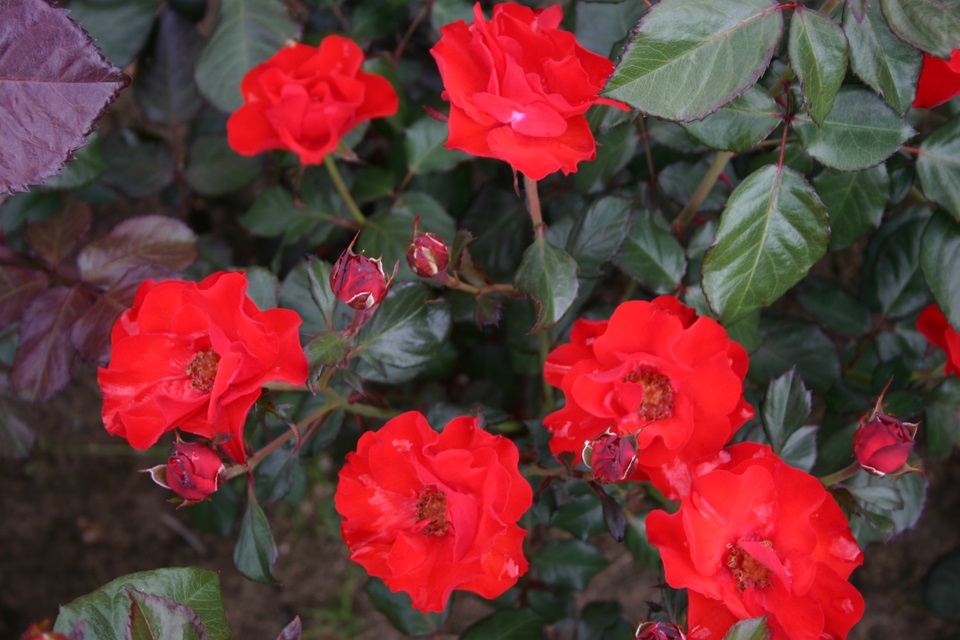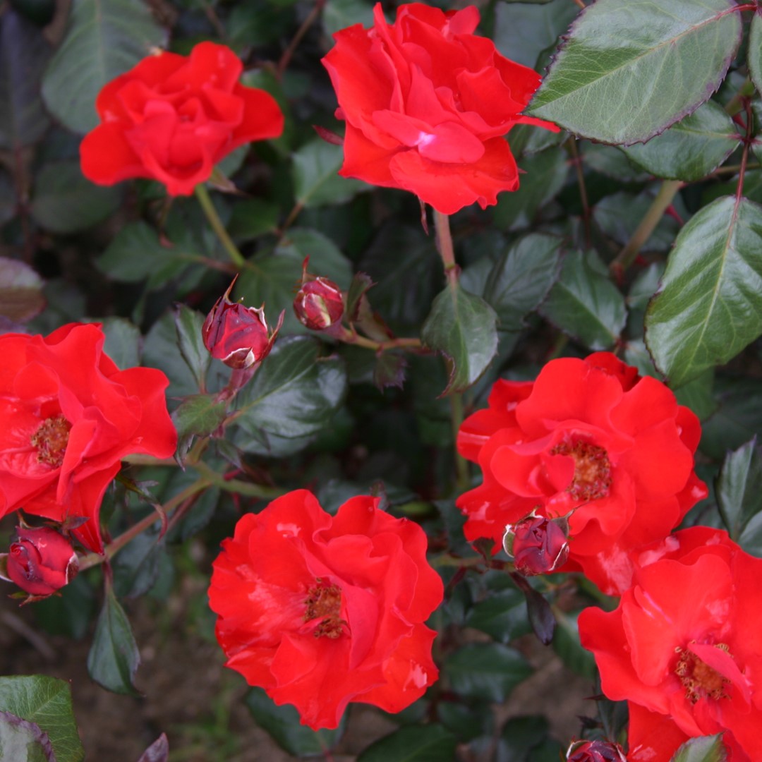 Compacte goed vertakkende plant met helder dieporanje bloemen dicht op het gewas. Het blad is fraai donker mahoniekleurig en de roos bloeit lang door.