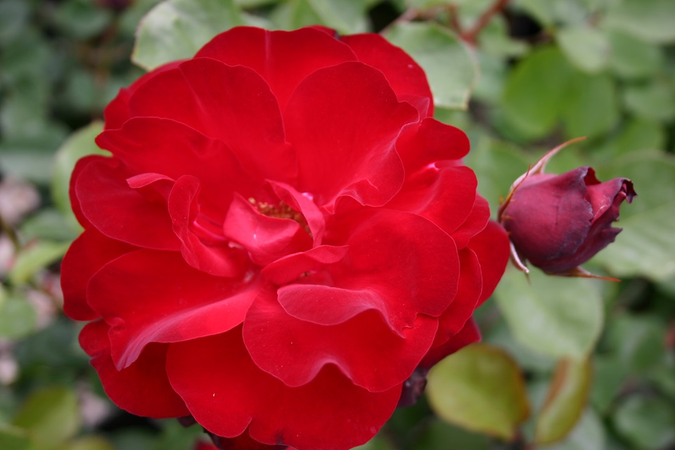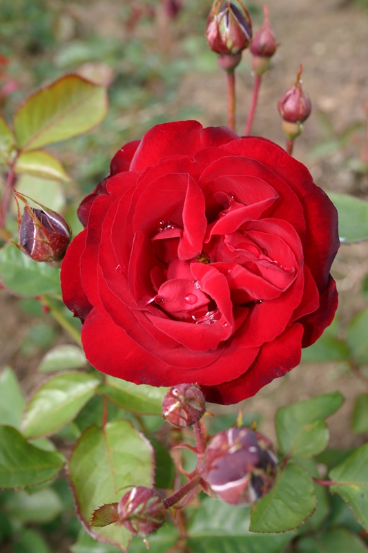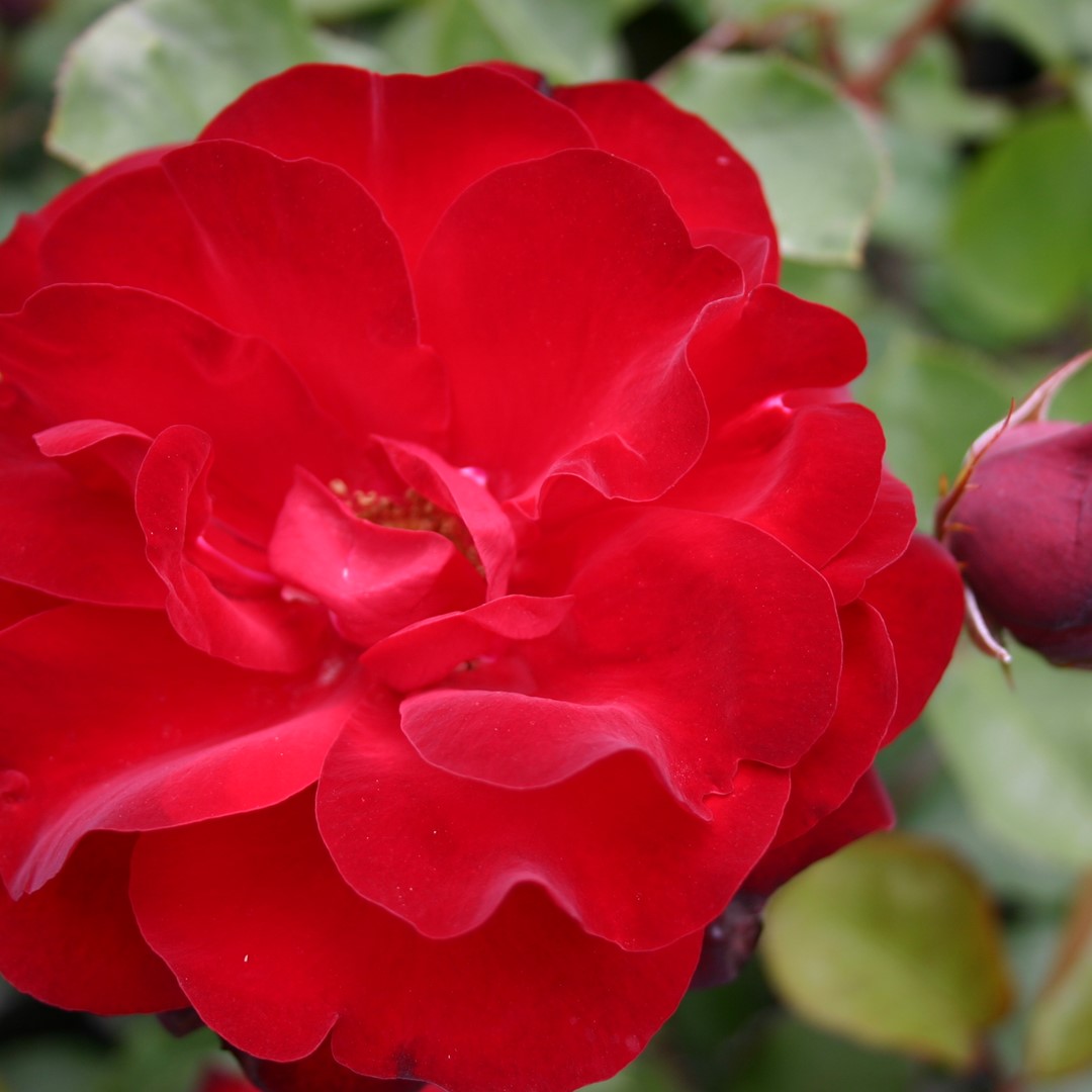 De grote, losjes gevulde, schaalvormige bloemen zijn fluweel vuurrood in grote trossen. De plant groeit bossig, sterk vertakkend en gezond met stekels. De bloemen komen mooi uit tegen de licht brons overgoten bladeren. Schitterende en zeer rijkbloeiende perkroos die lang en betrouwbaar bloeit.