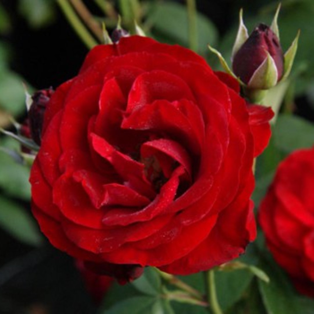 Donkerrode, niet verkleurende fluweelachtige bloemen, mooi gevuld. Donker blad. De bloemen staan fier boven de struik. Deze ADR-roos is gezond en sterk en heeft een bossige groeiwijze.