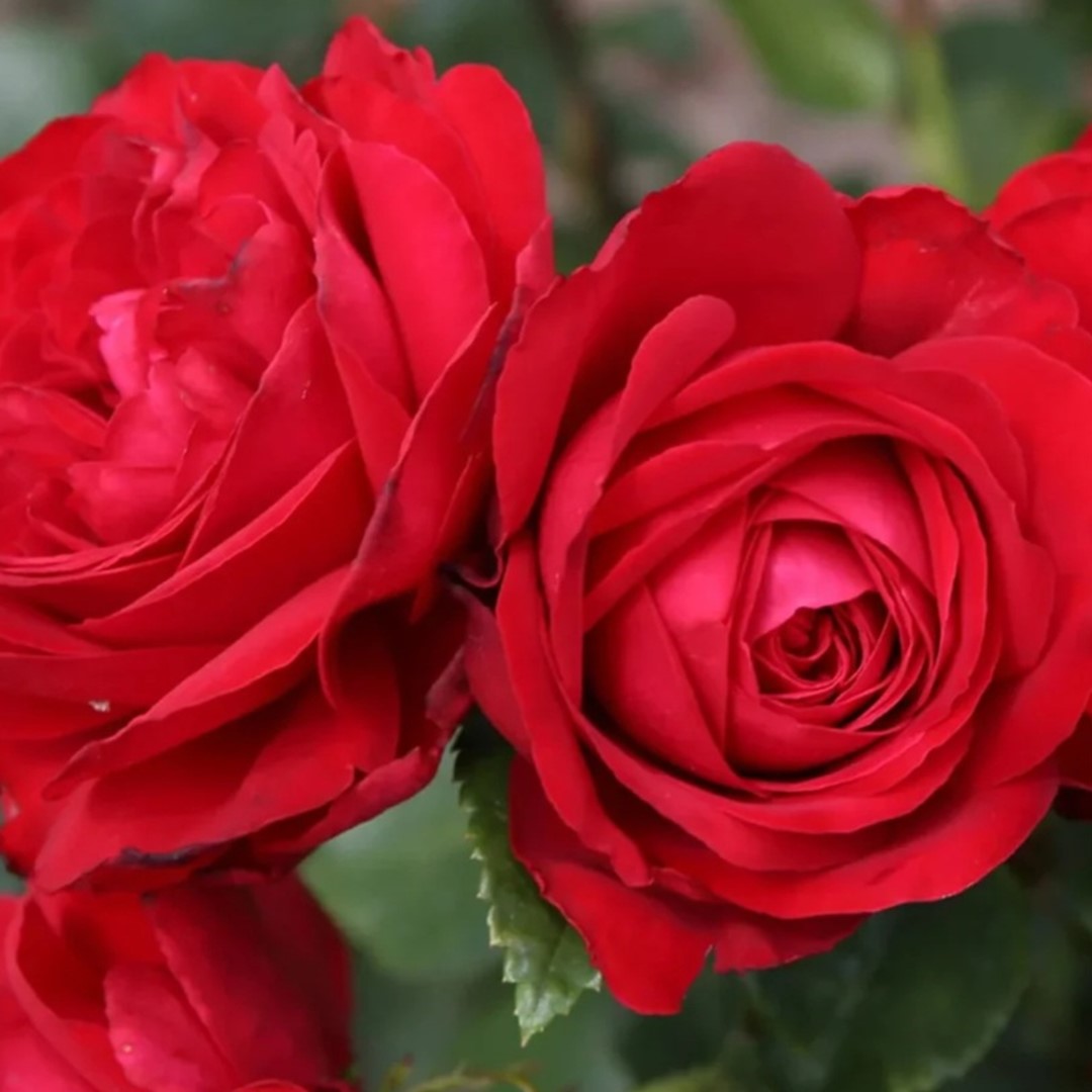 Mooie gevulde grootbloemige roos. Hij bloeit de hele zomer door in trossen met een dieprode kleur. Glanzend blad met een hoge bladgezondheid.