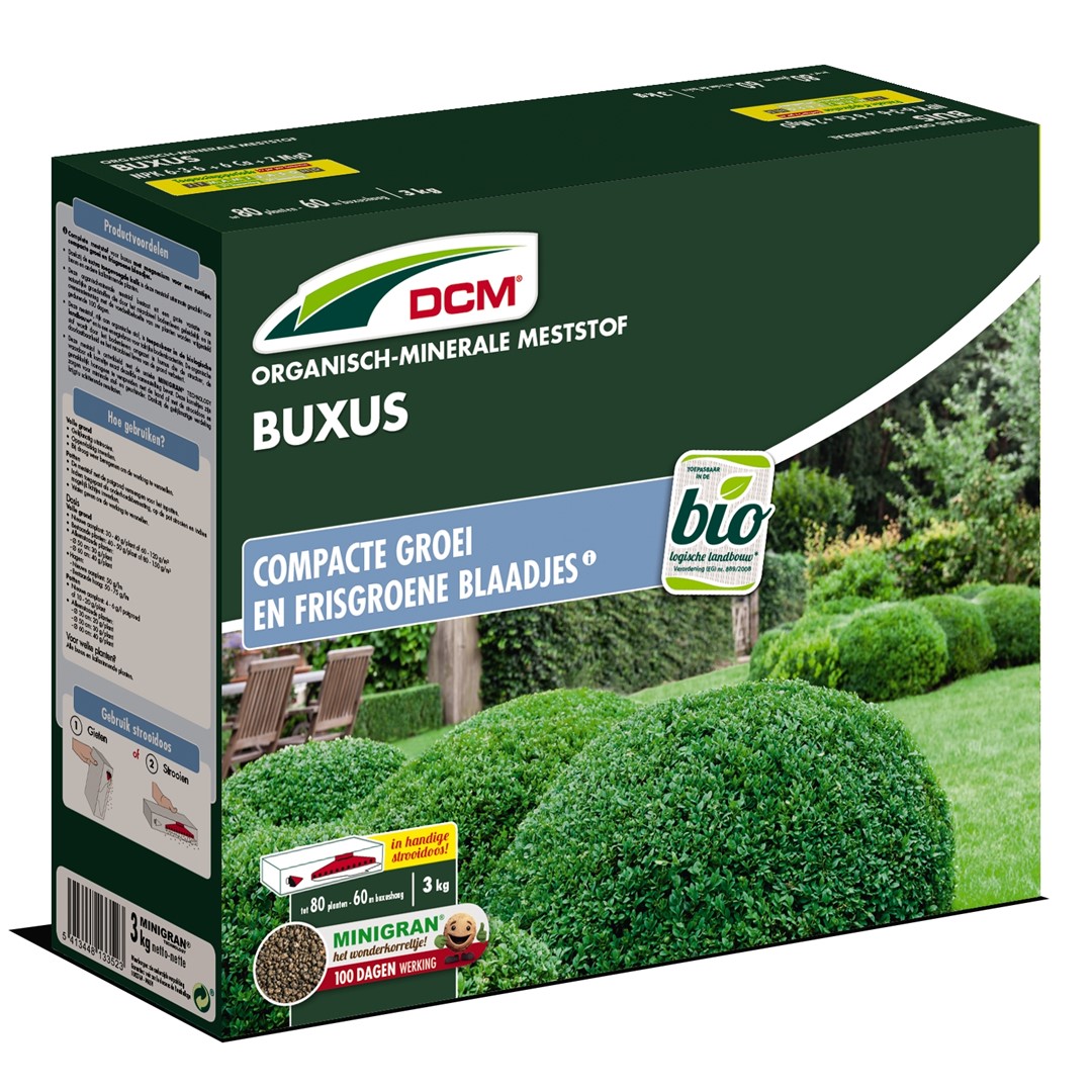 DCM Organische meststof Buxus zorgt voor een compacte diepgroene groei van de buxus door een evenwichtige verhouding van kalium en stikstof. De extra zeewierkalk zorgt voor een optimale zuurtegraad en magnesium voor een donkergroene kleur van uw buxus. Deze verpakking is 3 kg.