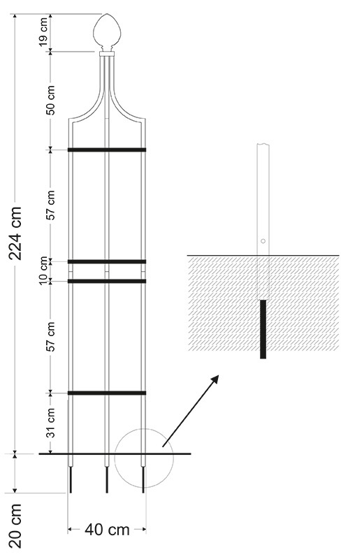 Verticale delen gemaakt van 2 cm dik gegalvaniseerd staal, horizontale banden gemaakt uit staalband; geheel gecoat in poederzwart. Hoogte: 230 cm plus 20 cm voor verankering in de grond. Diameter 40 cm, gewicht 18 kg.