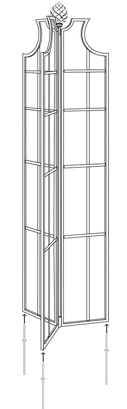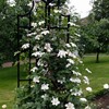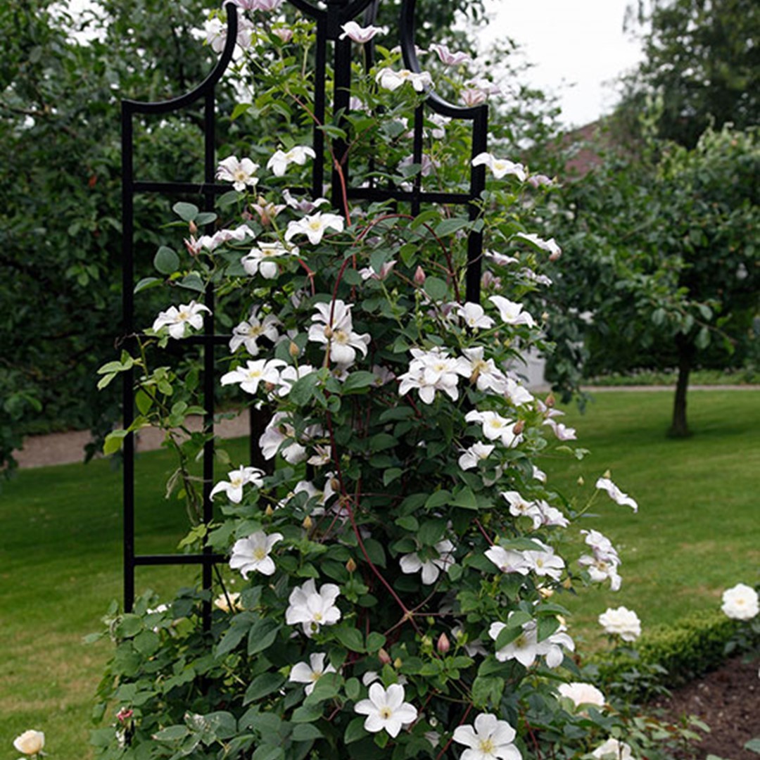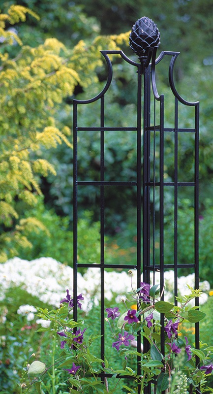Deze fraaie obelisk laat de gratie van de 'Belle Époque' weerleven. De delicate vormgeving harmonieert goed met de elegante bloemen van clematissen en rozen.