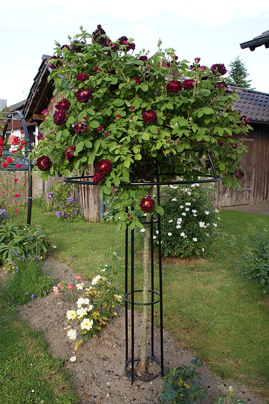 Rozencascades rollen over deze ijzeren parasol in Giverny. De takken van de treurrozen breken soms af tijdens sterke windstoten. De takken van uw kostbare roos zijn stormvast indien bevestigd aan deze 'rozenparasol'.