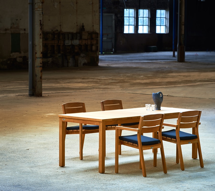 worden losgeschroefd en met het tafelblad worden opgeborgen. De Floris tafel is gemaakt van het allerbeste gecertificeerde (plantage) teakhout,