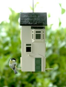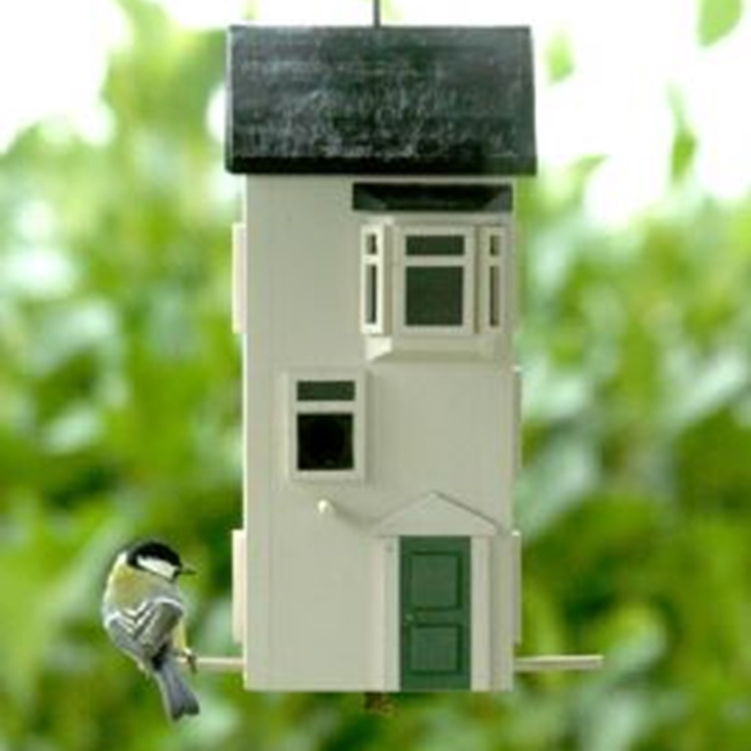 Het Townhouse kan gevuld worden met 2,2 liter vogelvoer. Uitermate geschikt is schilvrij vogelvoer zoals wildvogelmuesli. Schilvrij vogelvoer is ideaal voor het voeren in de stad omdat dit geen rommel geeft en het lokt nieuwe spannende vogelsoorten naar de voederautomaat. De vier voeropeningen zijn zo gemaakt dat de kleine vogels gemakkelijk de weg vinden naar het voer en met hulp van de zitstokjes kunnen de vogels comfortabel en hygiënisch eten zonder in het voer te zitten of het voer te vervuilen met hun uitwerpselen. De zitstokjes zijn zo kort dat de grote vogelsoorten geen houvast hebben en de kleine vogels dus ongestoord kunnen genieten van hun maaltijd. Het voer ligt beschermd tegen regen, sneeuw en wind en valt er niet uit als de voederautomaat door de wind heen en weer slingert. Het Townhouse is in Zweden ontwikkeld en handgemaakt van weerbestendig larikshout met dakbedekking op het dak. Het met voer vullen van het stadhuis is zeer eenvoudig door de splitpennen te verwijderen, het dak op te tillen en vervolgens het voer in het huisje te gieten. De voederautomaat behoeft geen vast montagepunt maar kan gemakkelijk opgehangen worden aan een tak of een haakje aan het balkon met behulp van het meegeleverde ophangkoord.