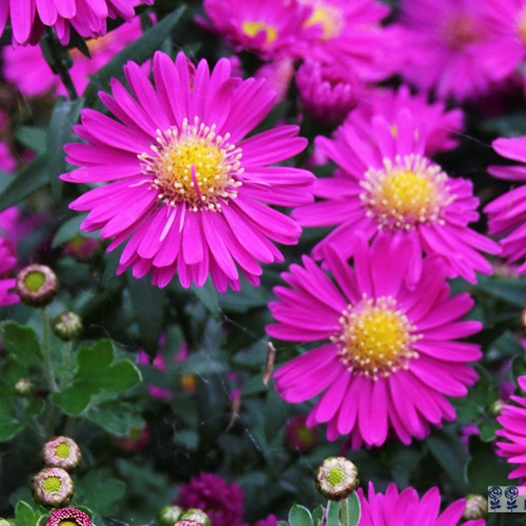 De Herfstaster Aster 'Bahamas' bloeit met roze bloemen, in de periode van september tot november.