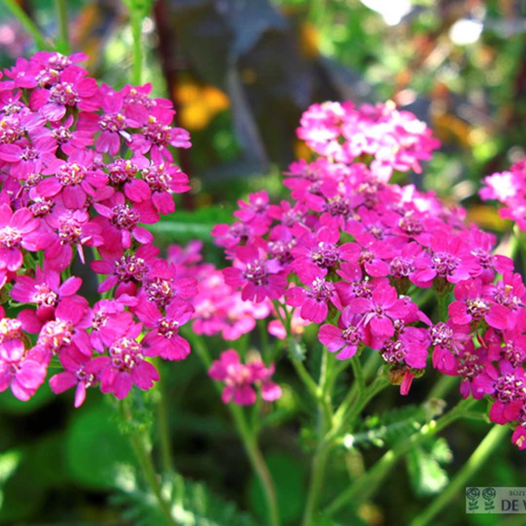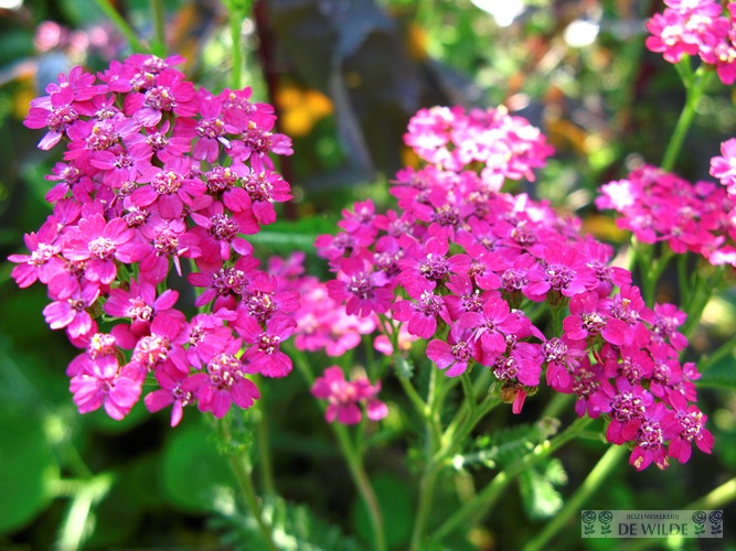 Achillea millefolium 'Cerise Queen' bloeit met roze schermvormige bloemen in de periode juni-september.