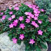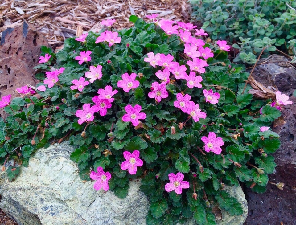 Laagblijvende en zodenvormende reigersbek met een roze bloem. Hij wordt 3 tot 5 cm hoog en is groenblijvend.