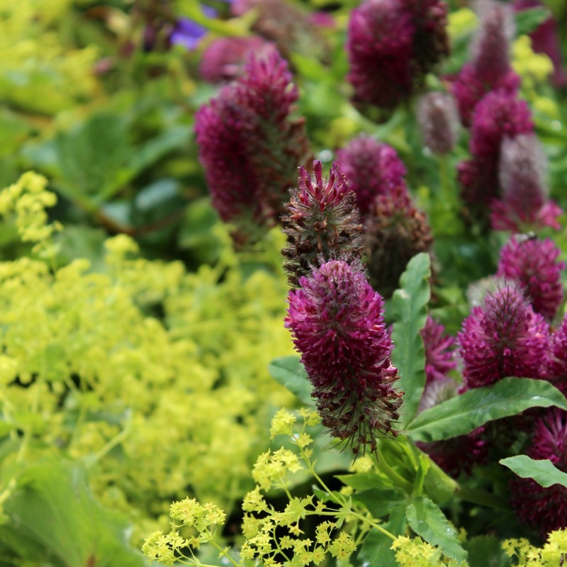 Deze klaver is een opvallende plant, vooral als hij begint te bloeien. De bloemknoppen zijn zilver behaard en hier komen purperrode bloemen uit. Op armere grond blijft de plant goed overeind staan. Als de grond wat vruchtbaarder is al hij breder worden en wellicht wat steun nodig hebben. Hij wordt 20 tot 30 cm hoog.