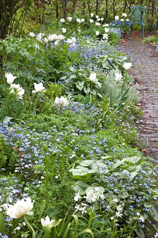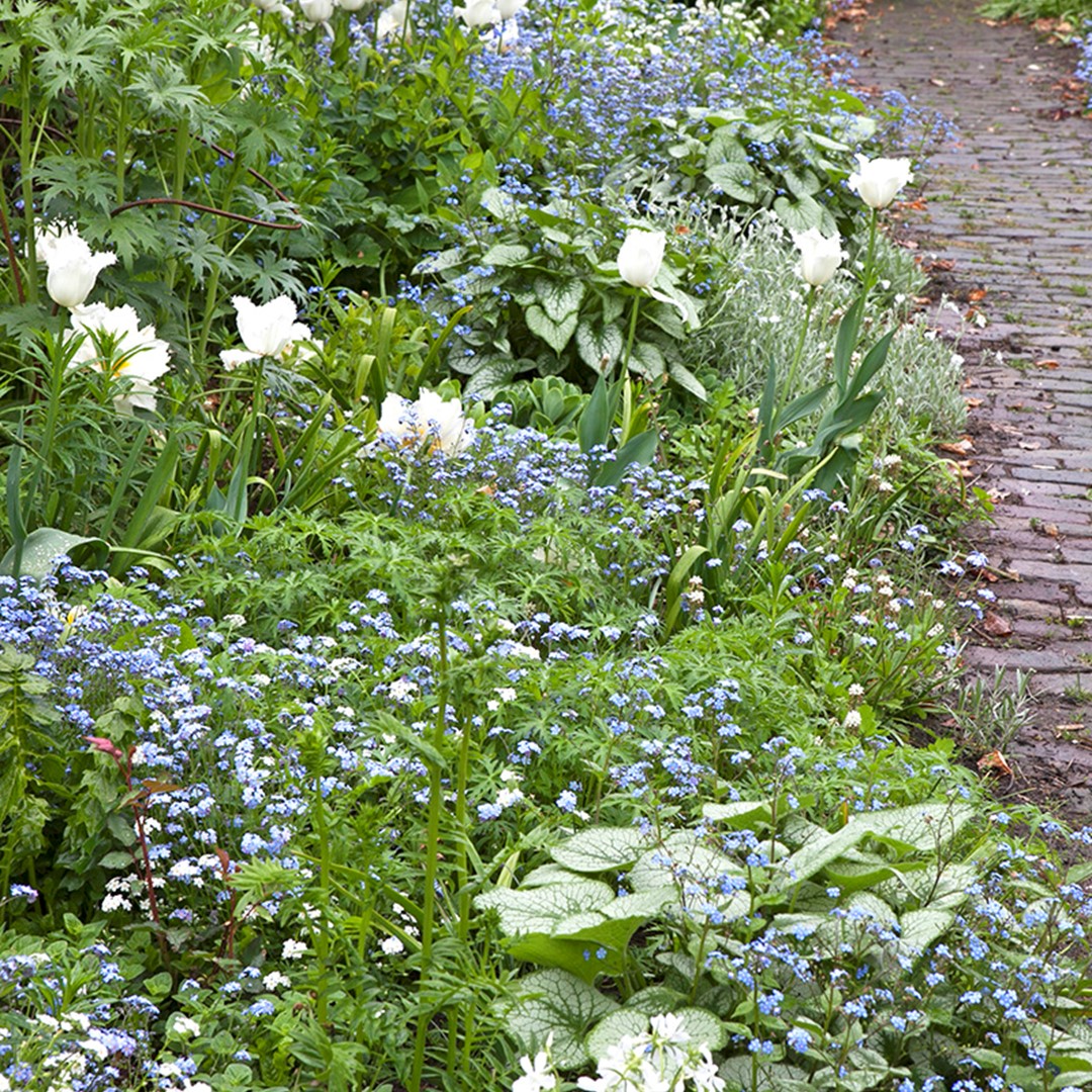 Wilt u dit jaar nog genieten van een rijk bloeiende voorjaarsborder in wit en blauw? Bestel dan nu het Bloem & Plant borderpakket met Brunnera. Het kaukasiche vergeet-mij-nietje Brunnera macrophylla ‘Jack Frost’ is de blikvanger in deze frisse voorjaarscombinatie. Het fraai getekende blad blijft ook in de rest van het tuinseizoen decoratief. Blauwe en witte bloemen vullen de border van april tot begin juni. De planten kunnen jarenlang op dezelfde plek blijven staan, ze komen elk voorjaar weer op. Alleen het gewone vergeet-mij-nietje is tweejarig, maar deze plant zaait zich rijkelijk uit. De beplanting is geschikt voor een plekje in de volle zon of halfschaduw.