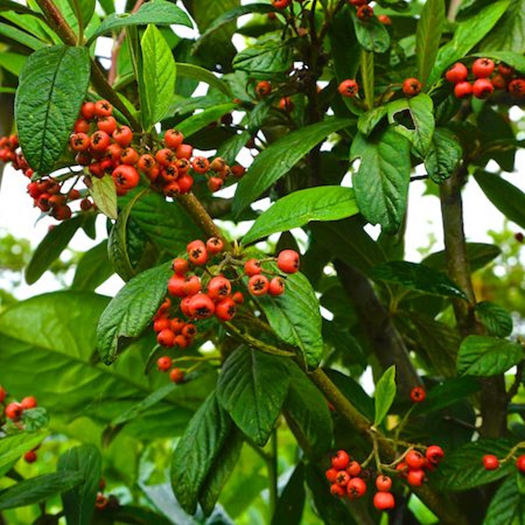 Bloeit in de late lente met trosjes van kleine, witte bloemen gevolgd door glanzend, helderrode besjes.