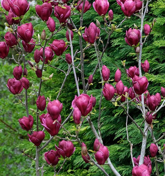 De Magnolia 'Genie' is een kleinblijvende Magnolia met donkerpaarse tot bijna Bordeauxrode tulpvormige tot komvormige bloemen. De bloemen behouden hun vorm en kleur erg goed. Na de rijke hoofdbloei rond april, kan er gedurende de zomer nog nabloei voorkomen.