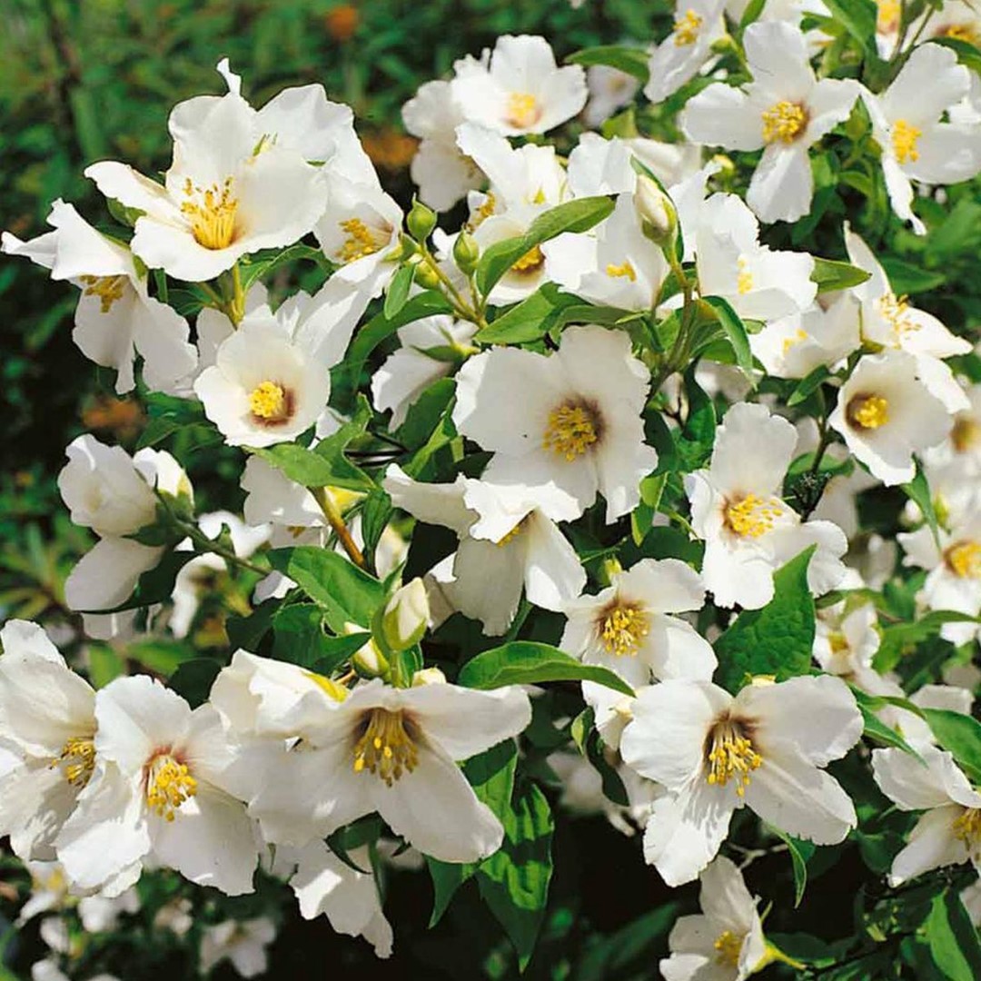 Philadelphus 'Belle Etoile' bloeit in mei/juni met vrij grote, crèmewitte, klokvormige, geurende bloemen, die bijen en vlinders aantrekken. Hij wordt ongeveer 2 meter hoog.