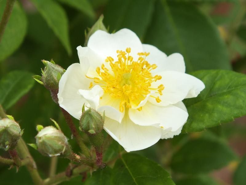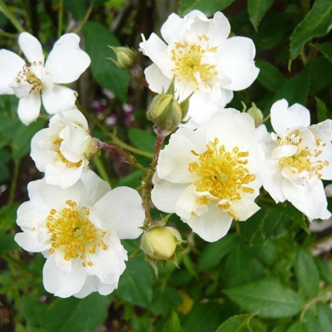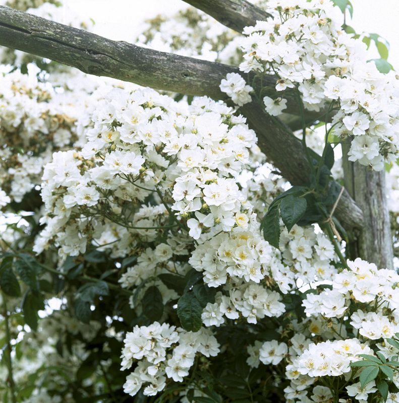 De klimmende Rosa Seagull betovert met grote trossen witte bloemen en gouden meeldraden. Deze ramblerroos verspreidt een heerlijke, sterke geur in juni en juli.