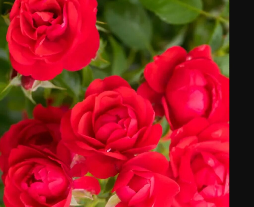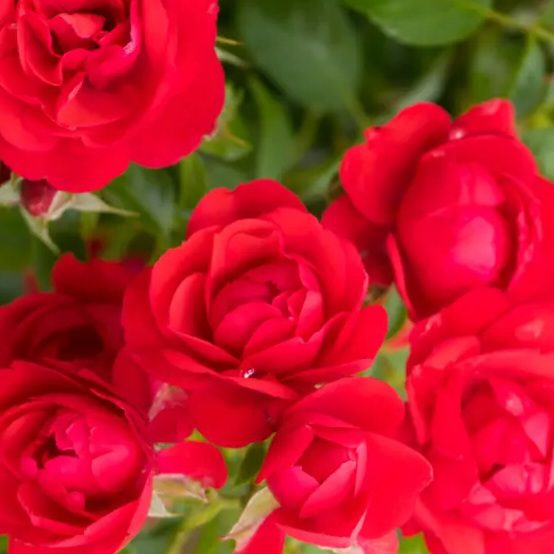 Een compacte, bossige roos van 50-70 cm hoog, met dicht donkergroen loof en die continu en in overvloed trossen halfdubbele, kersrode bloemen produceert van zomer tot herfst