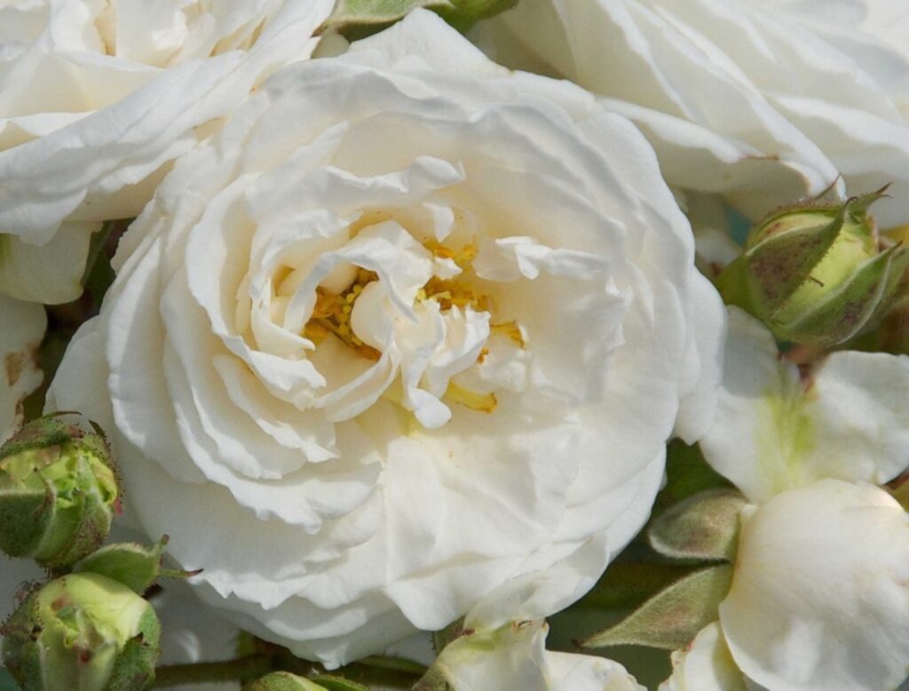 De ‘Rosa klimbing Perfume Dreams’ is een oude, verfijnde roos die bekendstaat om zijn platte, gekwartierde bloemen in een rozetvorm. De bloemen stralen in crèmewit, soms subtiel getint met een vleeskleurig roze hart.